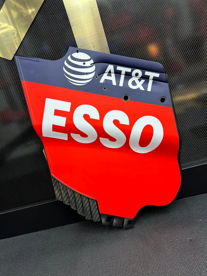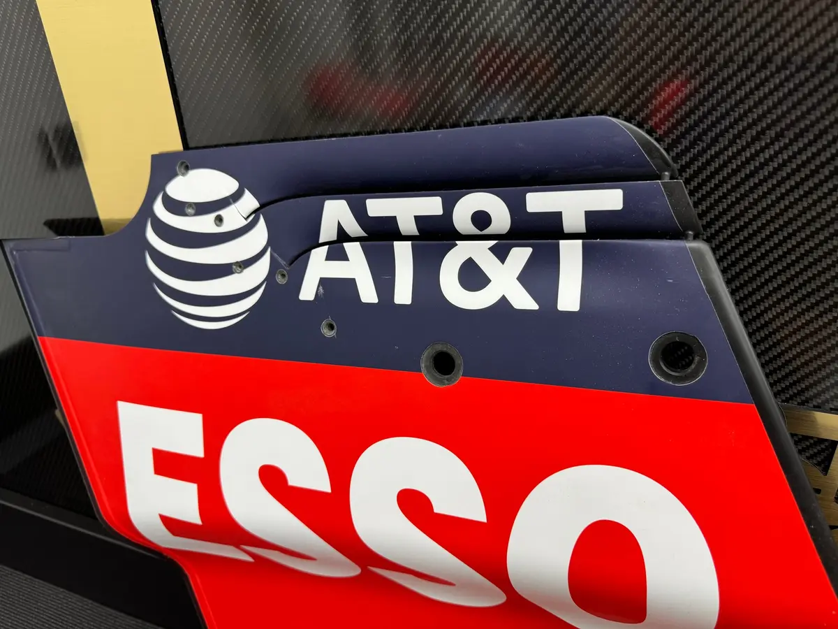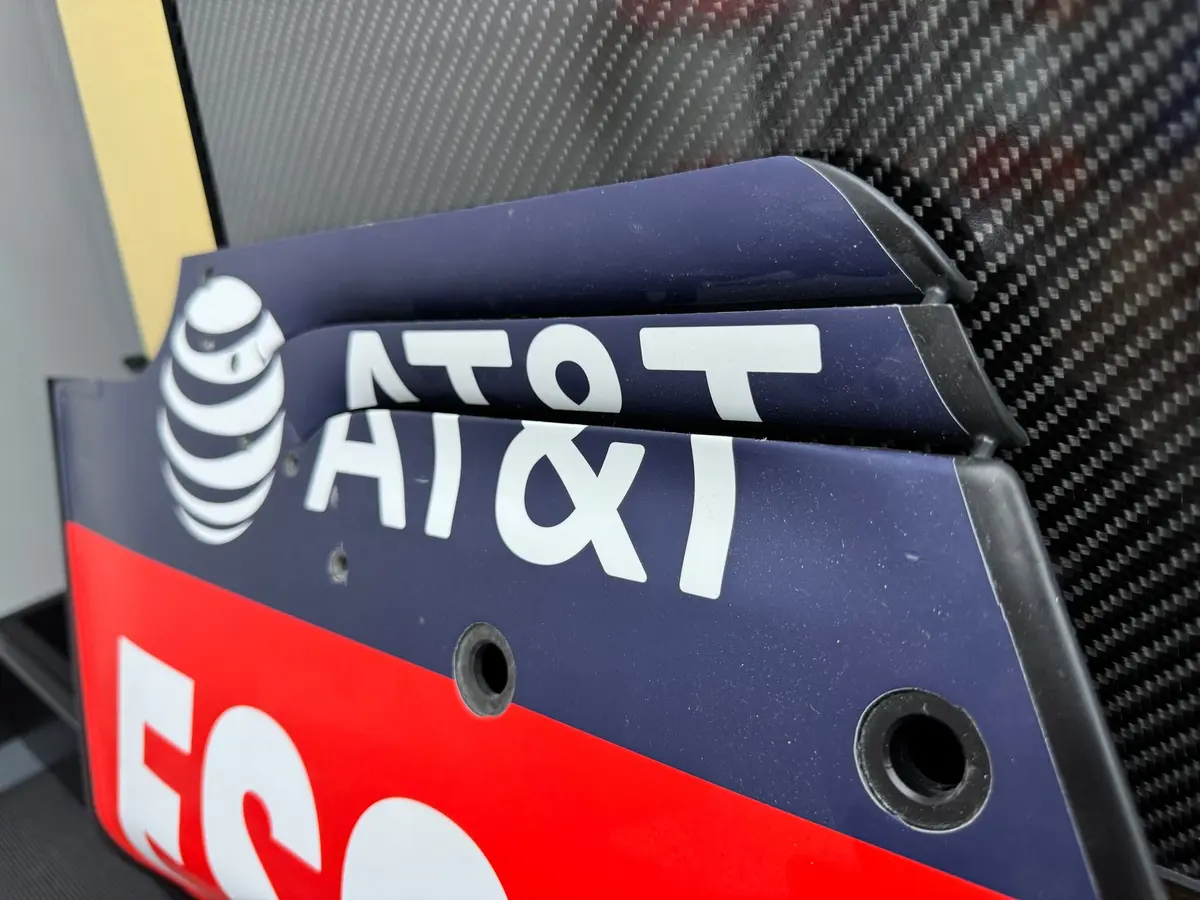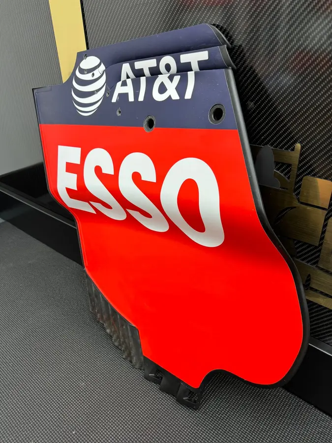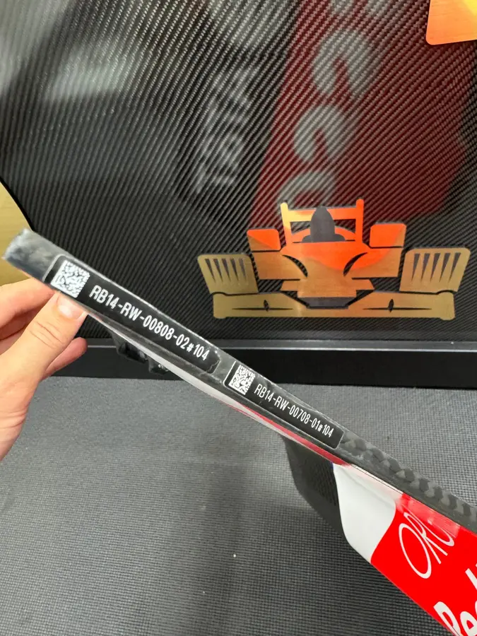 Dit onderdeel is gemaakt van koolstofvezel. Een heel licht en complex onderdeel. Je kunt het mooie patroon aan de achterkant van het item zien, samen met een hologram. Gebruikt op de Red Bull-auto uit 2018. Je kunt de auto op het internet zien.