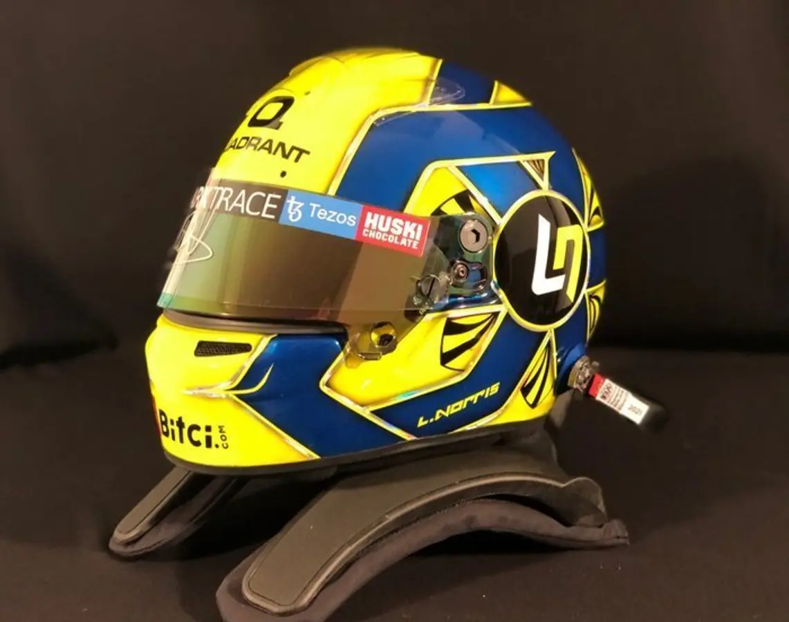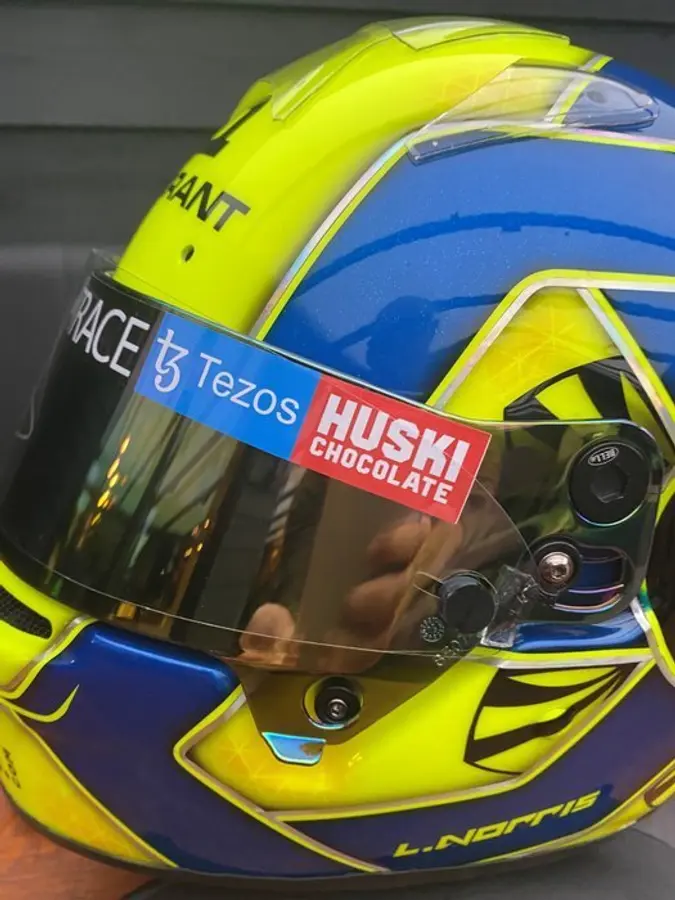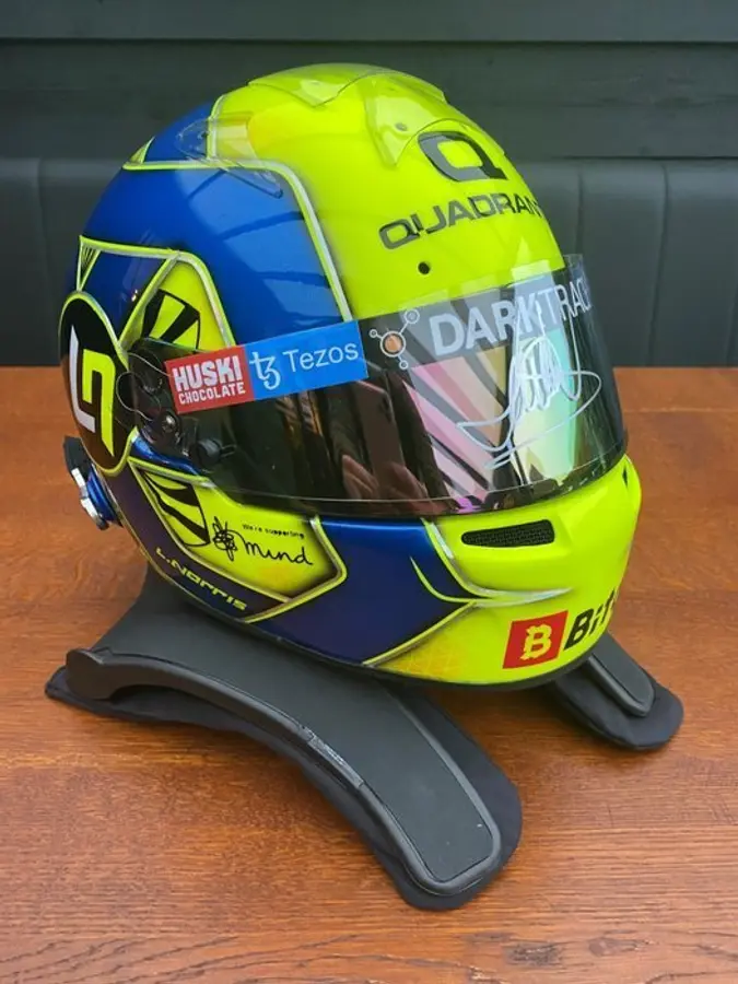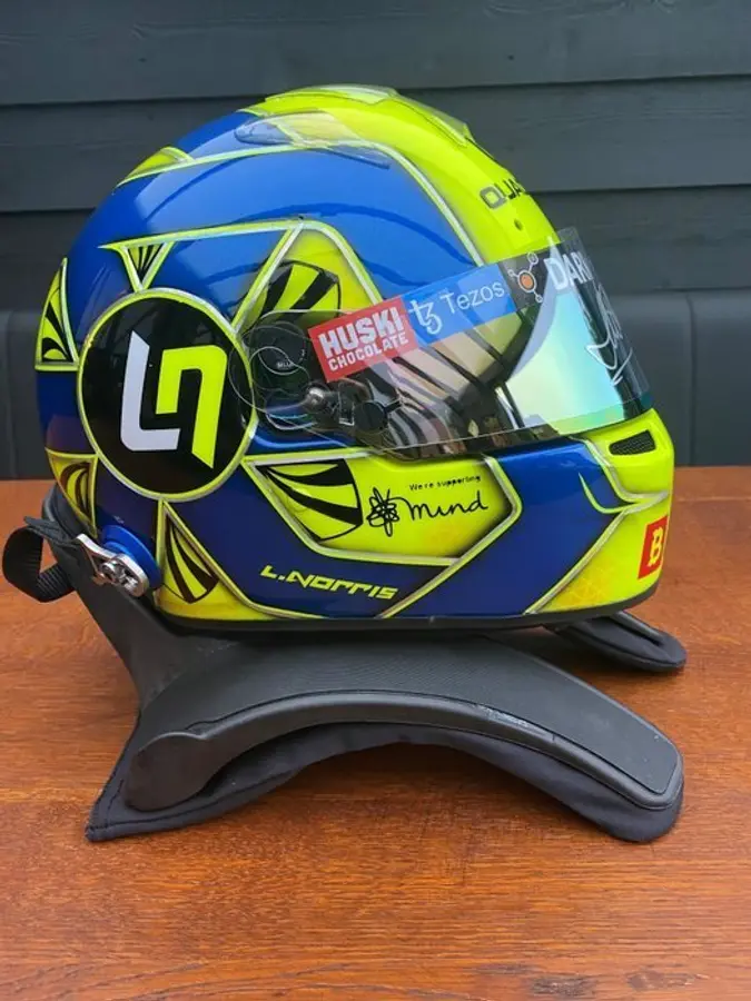Hier bieden we een geweldige recreatiehelm aan van Lando's 2021-helm. Zoals u kunt zien is deze Bell-helm perfect gespoten met alle verschillende sponsormerken. De opvallende felle fluorescerende gele, zilveren voering en de diepblauwe metallic afwerking maken deze helm een echte blikvanger. Dit geweldige exemplaar wordt ook geleverd met een HANS-apparaat (Head-And-Neck-System) dat u aan de HANS-clips aan de zijkanten van de helm kunt bevestigen om deze helm nog indrukwekkender te maken.
